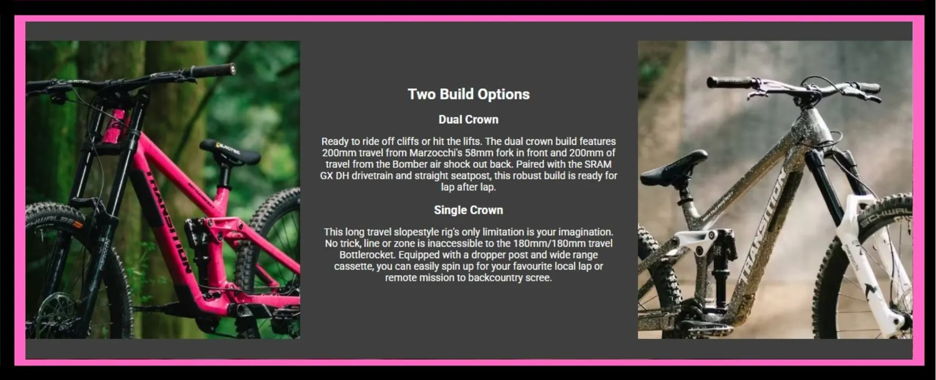 Transition Bottlerocket Alloy MTB Dual Crown Complete Bike Disco Flamingo. The legendary Transition Bottlerocket is back. DH Gravity MTB for the true adrenaline junkie