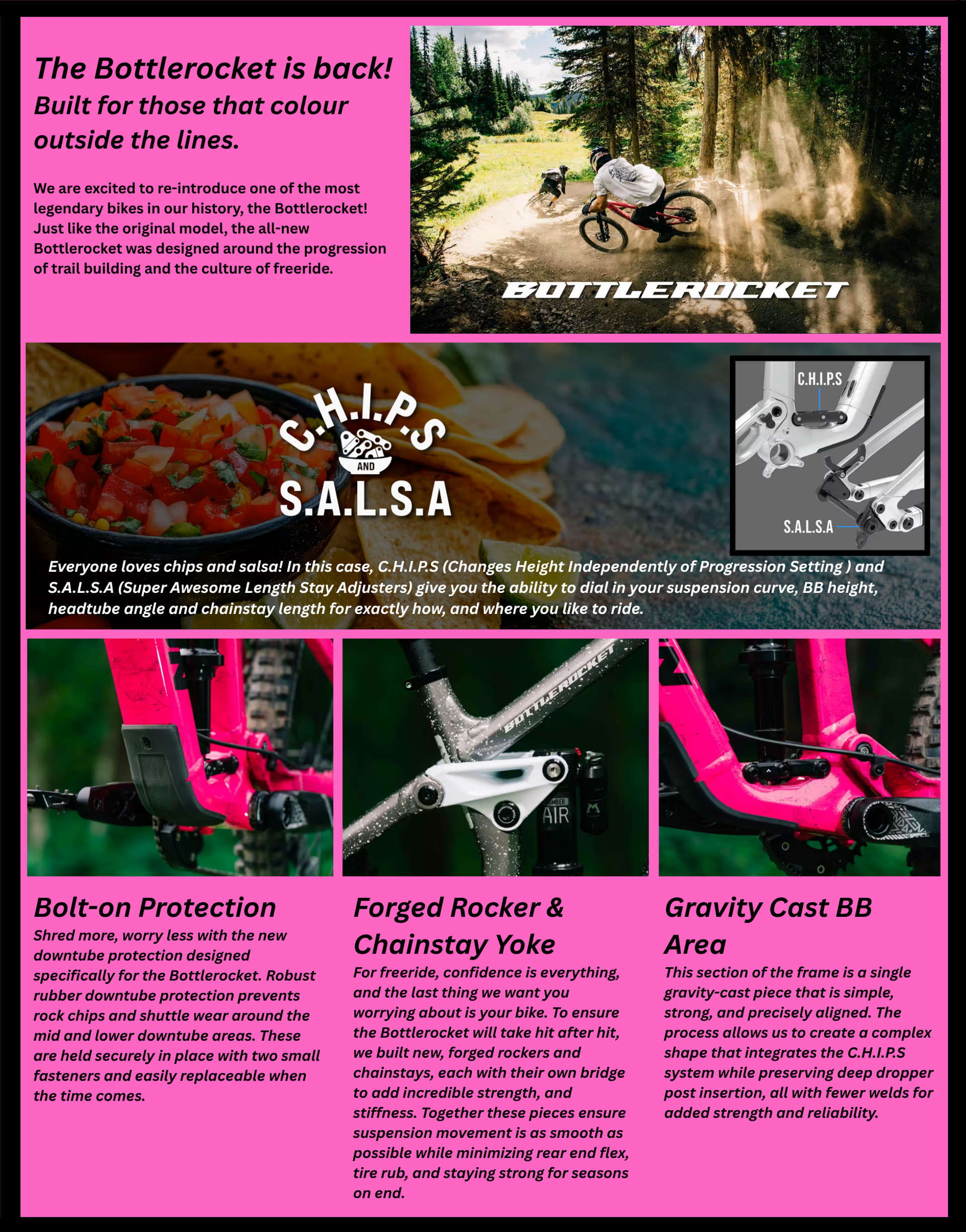 everyone loves chips and salsa! In this case, c.H.I.P.S. (changes height independently of progression setting ) and s.A.L.S.A. (super awesome length stay adjusters) give you the ability to dial in your suspension curve, bb height, headtube angle and chainstay length for exactly how, and where you like to ride.