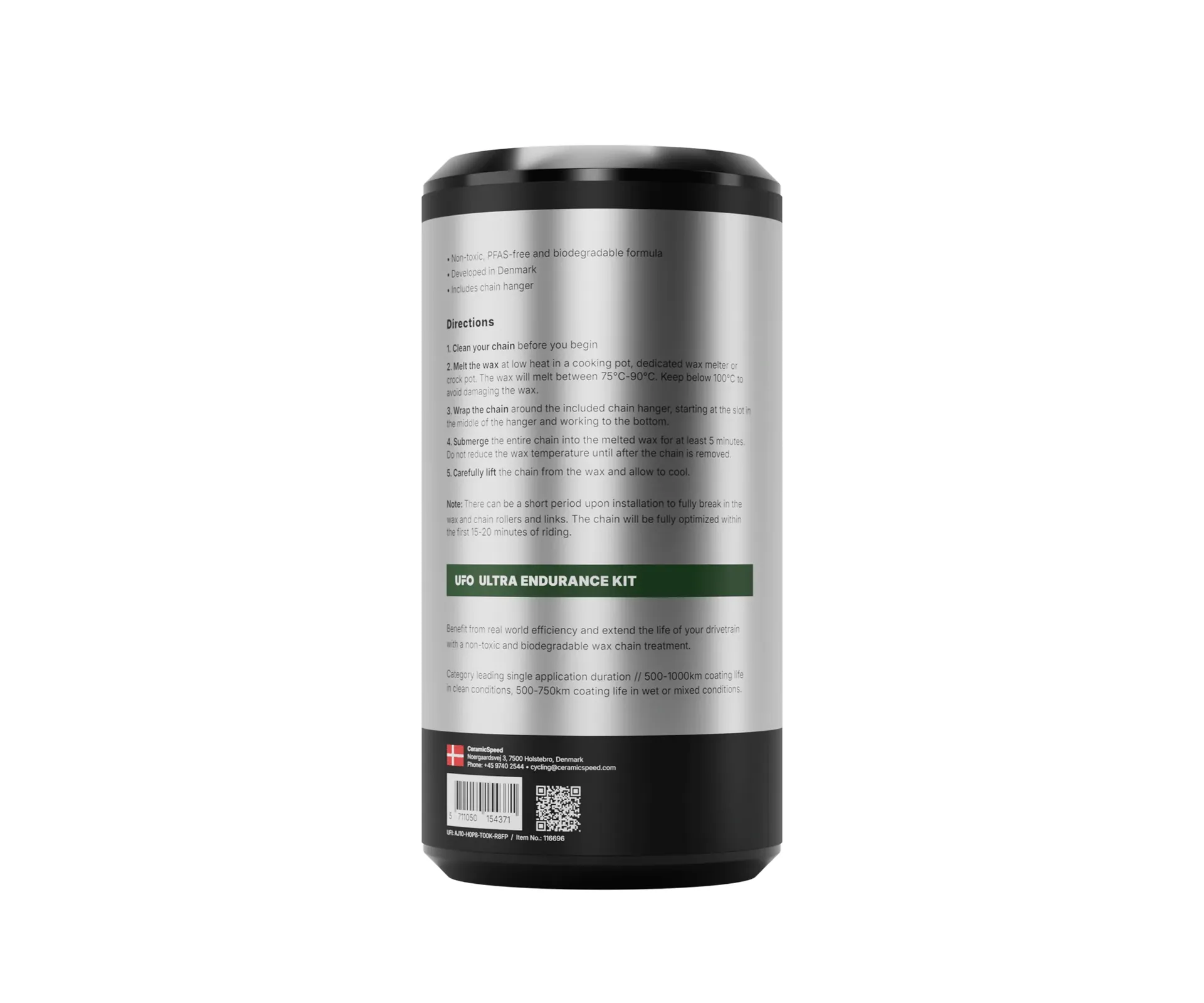 UFO WAX Ultra Endurance is a long‑lasting submersive wax chain lubricant designed for extended rides in challenging and mixed conditions. It delivers low friction, long lasting protection, and reduced contamination, making it ideal for endurance riders who want consistent performance over many hours. This kit is delivered in a unique heat safe cylinder packaging offering an easy way for first time wax users, or those without a dedicated wax melter, to use a double boiler setup with a hot water bath to melt the wax and treat their own chains. Comes with 400 g of wax pellets and our innovative molded chain hanger that prevents the chain from getting tangled while submerged and processed.